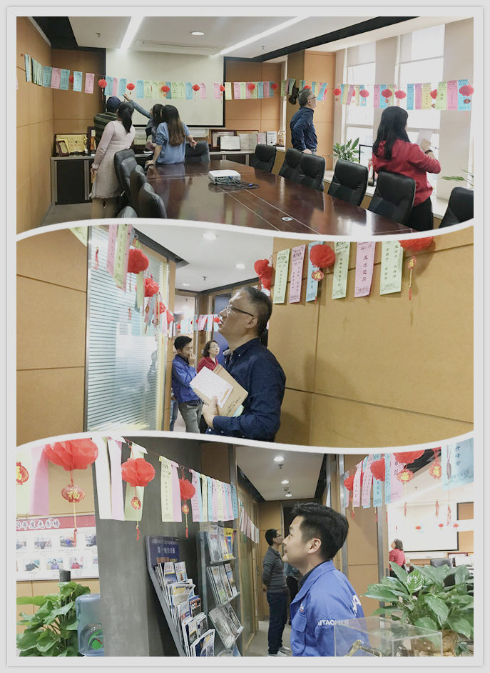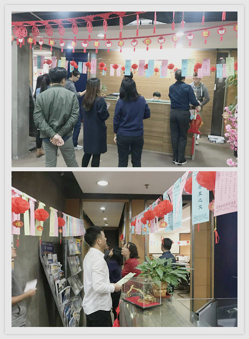 總公司前臺(tái)、會(huì)議室、辦公室走廊等掛滿了喜氣洋洋的紅燈籠以及400道彩色燈謎條。來自美鵬的高手們爭(zhēng)相競(jìng)技,猜謎博弈,現(xiàn)場(chǎng)不時(shí)傳來陣陣笑語(yǔ)。